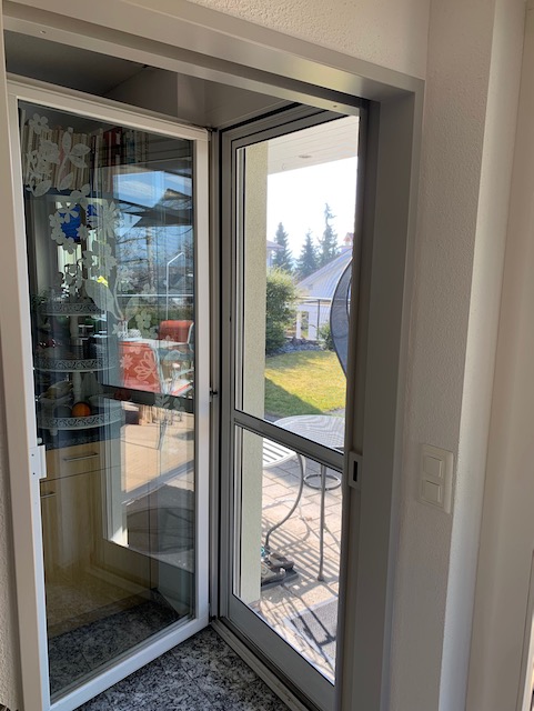 Insektenschutzpendeltür von Rollfix in der Standardfarbe weiss RAL 9016. Das Gewebe ist ein Transparent-Gewebe, fast unsichtbar.
