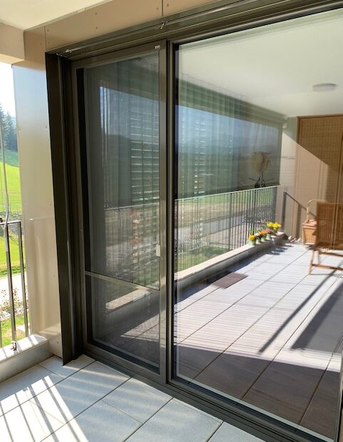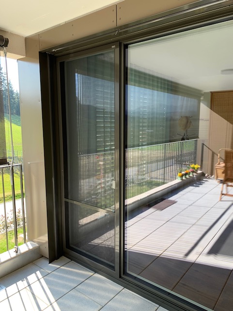 Insektenschutzschiebetür von Neher in Soderfarbe. Hier wurde eine Quersprosse verbaut im unteren Bereich. Das dient dem Schutz vor Beschädigung durch unbeabsichtigtes verfangen im Netz, da ja das Gewebe schon ziemlich schlecht sichtbar ist.