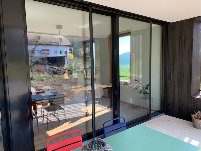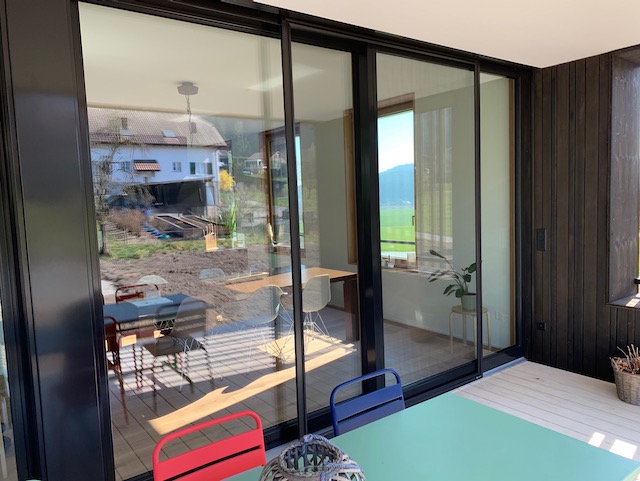 Insektenschutzschiebetür mit gewaltigen Ausmassen. Die Tür ist ca 3 m hoch und 2.5 m breit. Mit dem Transpatec-Gewebe von Neher ist zudem das Gewebe fast nicht sichtbar. Die Tür ist natürlich passend zu den Fenstern in Sonderfarbe eingefärbt.