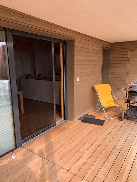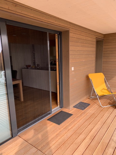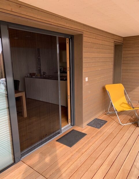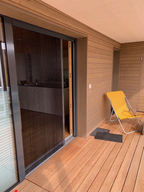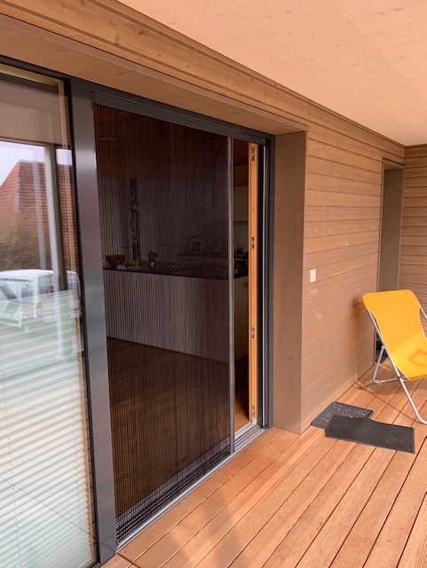 Insektenschutztürplissée in Sonderfarbe passend zum Fensterrahmen eingefärbt. Mit der extraflachen Bodenführungsschiene von nur 4 mm entsteht ein fast unsichtbarer Übergang, der auch mit einem Rollstuhl überfahrbar ist.