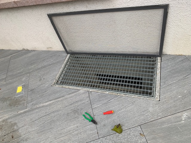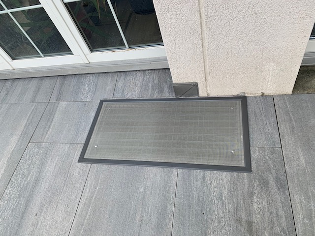 Lichtschachtabdeckungen, auch für den perfekten Abschluss zu den Gartenplatten. Hier auch in der Ausführung mit dem speziellen Edelstahlgewebe für Wärmepumpen Zu- und Abluft.